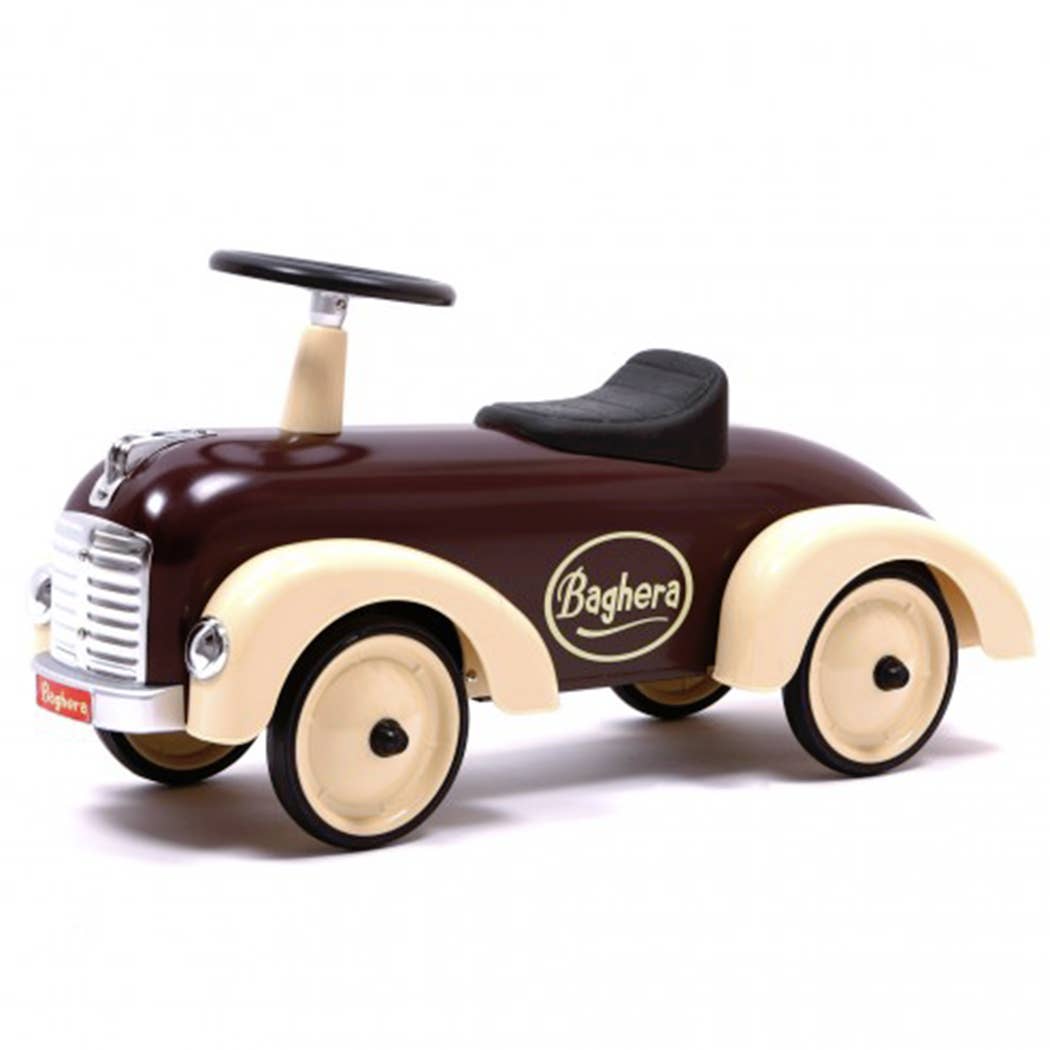 Vintage style: the brown speedster ride on has a strong vintage look with its large wheels, mudguards and beautiful chrome grille. With its unmistakable style, it will appeal to parents and children alike.